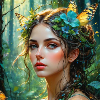 The image features a young woman with fair skin and long dark hair. She has striking blue eyes. On her head, she wears a crown of flowers that resemble a butterfly in appearance. Her makeup includes prominent red lips and eyelashes adorned with jewels. The background is a fantastical forest setting with tall trees and various plants. There are fluttering blue butterflies around her, suggesting movement. The overall style of the image is illustrative with a focus on fantasy elements.