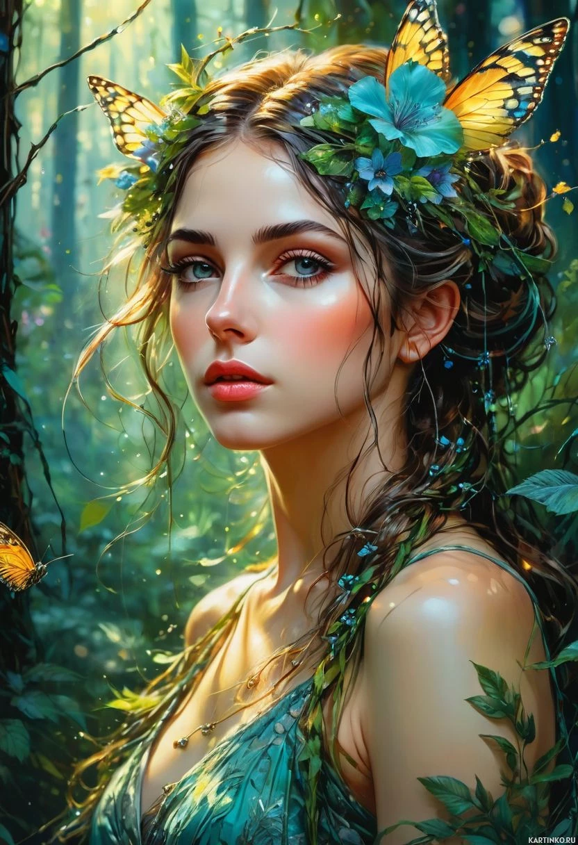 На картинке изображена молодая женщина со светлой кожей и длинными темными волосами. У неё поразительные голубые глаза. На голове у неё венок из цветов, напоминающих бабочку. Макияж включает яркие красные губы и ресницы, украшенные драгоценностями. Задний план – сказочный лес с высокими деревьями и разнообразной растительностью. Вокруг неё порхают голубые бабочки, создавая ощущение движения. Общий стиль картинки – иллюстративный, с акцентом на фантастические элементы.
