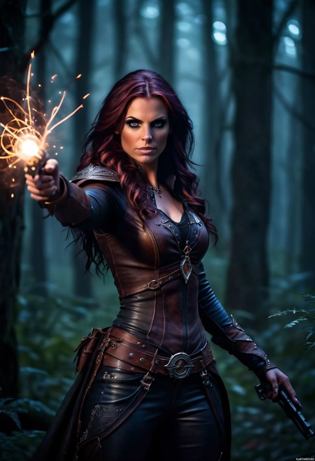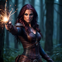 На картинке изображена женщина в темной лесной местности. На ней, похоже, наряд персонажа из фэнтези – кожаная броня, а в правой руке она держит нечто вроде волшебной палочки или посоха. Рядом с верхушкой палочки заметен эффект искр, будто происходит колдовство или заклинание. Выражение ее лица серьезное и сосредоточенное, она смотрит прямо в камеру с несколько пронзительным взглядом. Место действия окутано туманом, вокруг зелень, что создает волшебную, мистическую атмосферу.