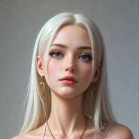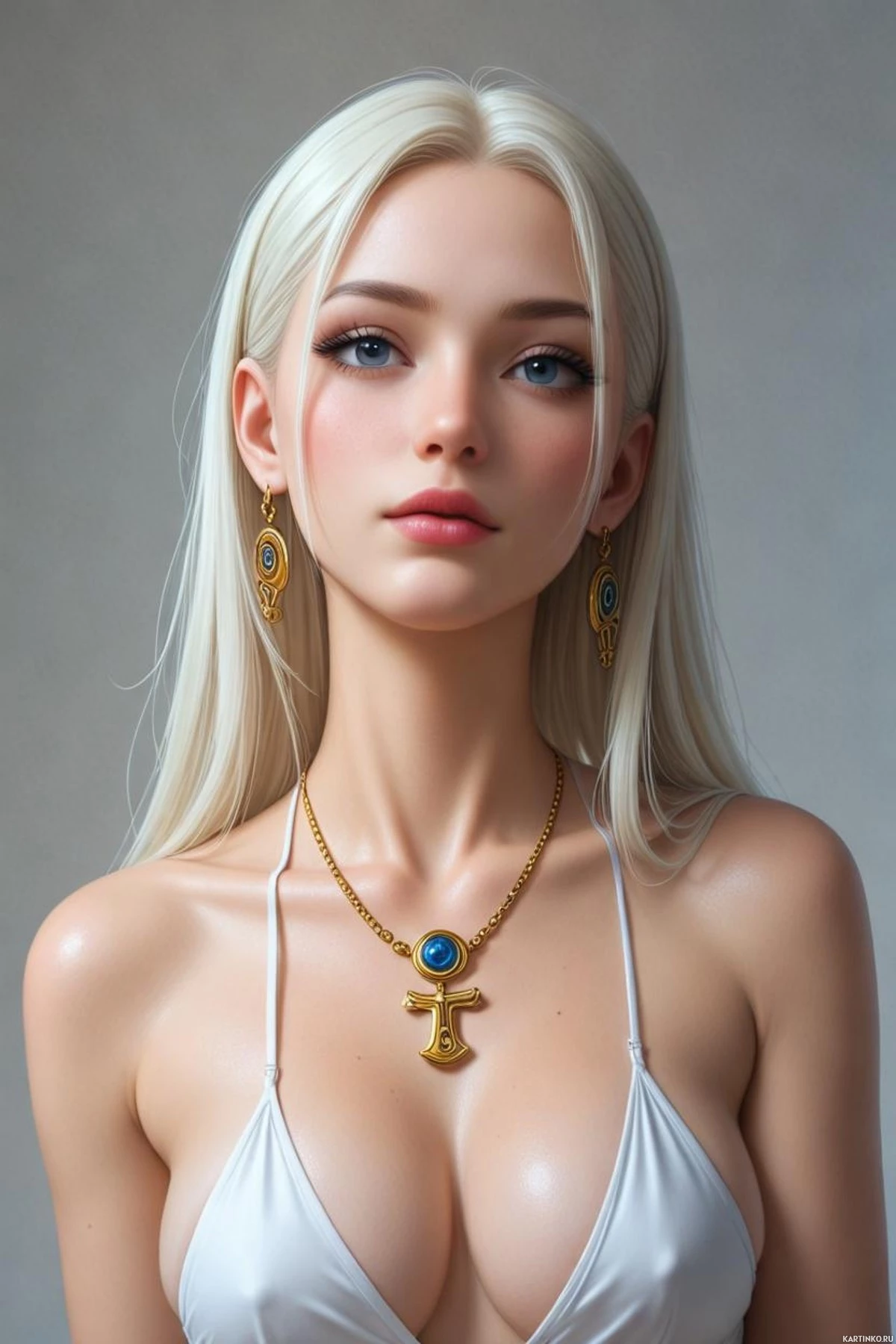 На картинке изображена девушка с белыми волосами и поразительными голубыми глазами. У нее бледная кожа, она одета в топ без рукавов с вырезами, открывающими плечи. На шее у нее нежное золотое ожерелье с крупным камнем. Выражение лица нейтральное, она смотрит прямо на зрителя. Осанка прямая и расслабленная, у нее выразительные, женственные черты, что говорит о стилизованном образе красоты.
