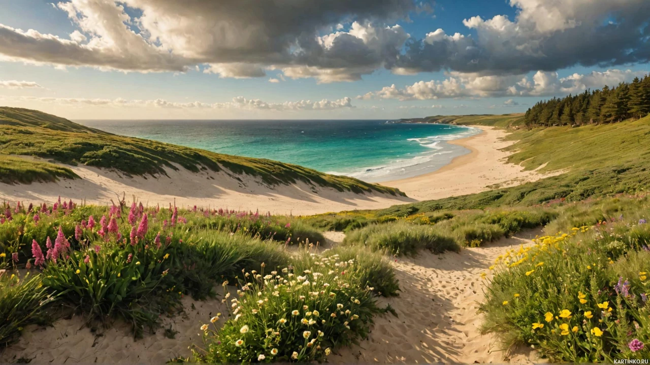 a coastal scene. The image captures a picturesque landscape with a sandy beach that gently slopes towards a calm