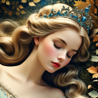 The image features a digital illustration of a female character with blonde hair and closed eyes. She appears to be wearing some form of fantasy or historical attire, including what looks like a crown on her head. The background has a dark, almost moonlit ambiance with silhouettes that could suggest trees or foliage. There are also small details that resemble stars or lights twinkling in the distance. The overall style of the image is reminiscent of fantasy artwork commonly found in illustrated books or video games.