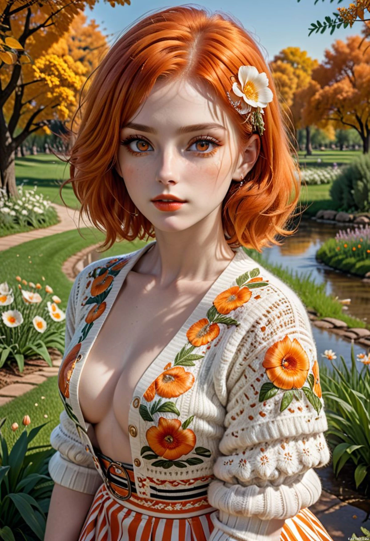 На картинке изображена молодая женщина с рыжими волосами, уложенными мягкими волнами. У нее светлая кожа, а макияж включает четко очерченные брови, подведенные глаза и чувственные губы. Взгляд ее направлен немного в сторону, от зрителя. На ней – рубашка в народническом стиле с цветочной вышивкой на лифе, в сочетании с коричневыми леггинсами с кружевной отделкой по низу. Над правым плечом – белое флористическое украшение. На заднем плане – травянистая местность с опавшими листьями, что создает ощущение осени. Вдали видны деревья с меняющей цвет листвой, усиливающие сезонную атмосферу картинки.