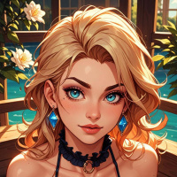 The image depicts a three-dimensional rendered character of a young female with blonde hair and blue eyes, wearing a fantasy-style outfit that includes corsets. She has a neutral expression on her face and is surrounded by an environment that suggests a serene and magical setting, possibly within a garden or a park area at dusk due to the soft lighting.