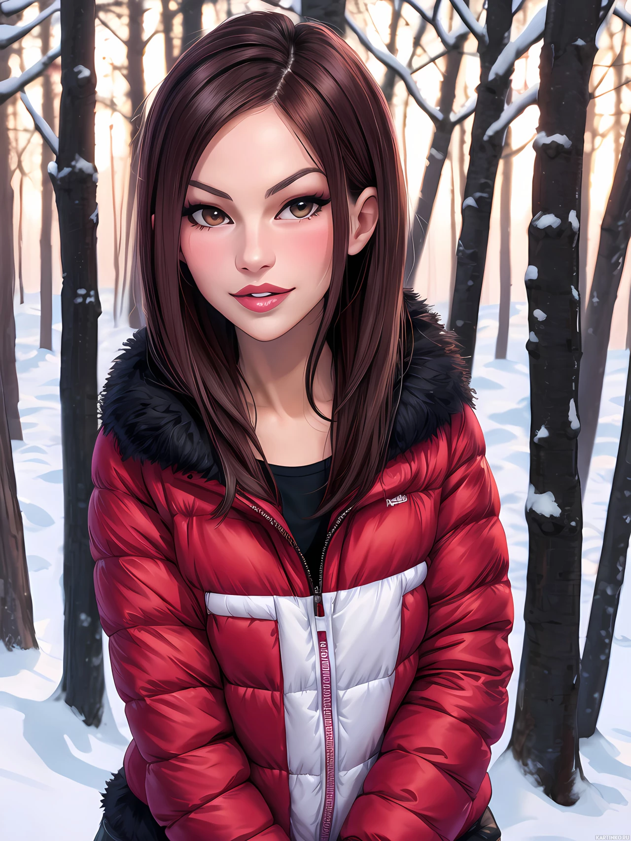 На картинке молодая женщина сидит на упавшем дереве в заснеженном лесу на закате. Теплый свет, пробивающийся сквозь деревья, создает уютную атмосферу. На ней красная и белая пуховая куртка с меховым капюшоном – привычная зимняя одежда для защиты от холода. Выражение лица нейтральное, она смотрит немного в сторону. На заднем плане – голые ветви на фоне оранжевого неба, что говорит о наступлении зимы или конце осени.