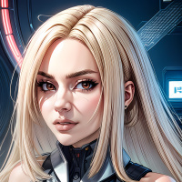 The image features a digital artwork of a female character with blonde hair and striking blue eyes. She has an even complexion and is wearing futuristic-looking armor that appears to be made of metal, with visible circuitry and pipes on the chest area. Her expression is neutral with a hint of seriousness. The background suggests a high-tech setting with glowing energy fields and what looks like an advanced interface or control panel. There are also robotic elements in the design, including mechanical arms or attachments to her armor, which contribute to the overall theme that combines human characteristics with mechanical enhancements.