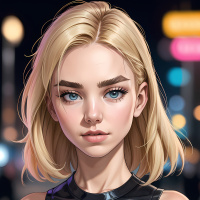 The image features a young woman with blonde hair and blue eyes looking directly at the camera. Her makeup includes defined eyebrows, dark lipstick, and accentuated cheekbones, which suggests a stylized or dramatic look. She has short, styled hair that frames her face. The girl is wearing what appears to be a black leather garment with a zippered front, adding to the edgy aesthetic of the image. Her expression is neutral and poised. The background is out of focus but seems to depict a night-time urban setting, possibly a street or alleyway, contributing to a noir or gritty ambiance.
