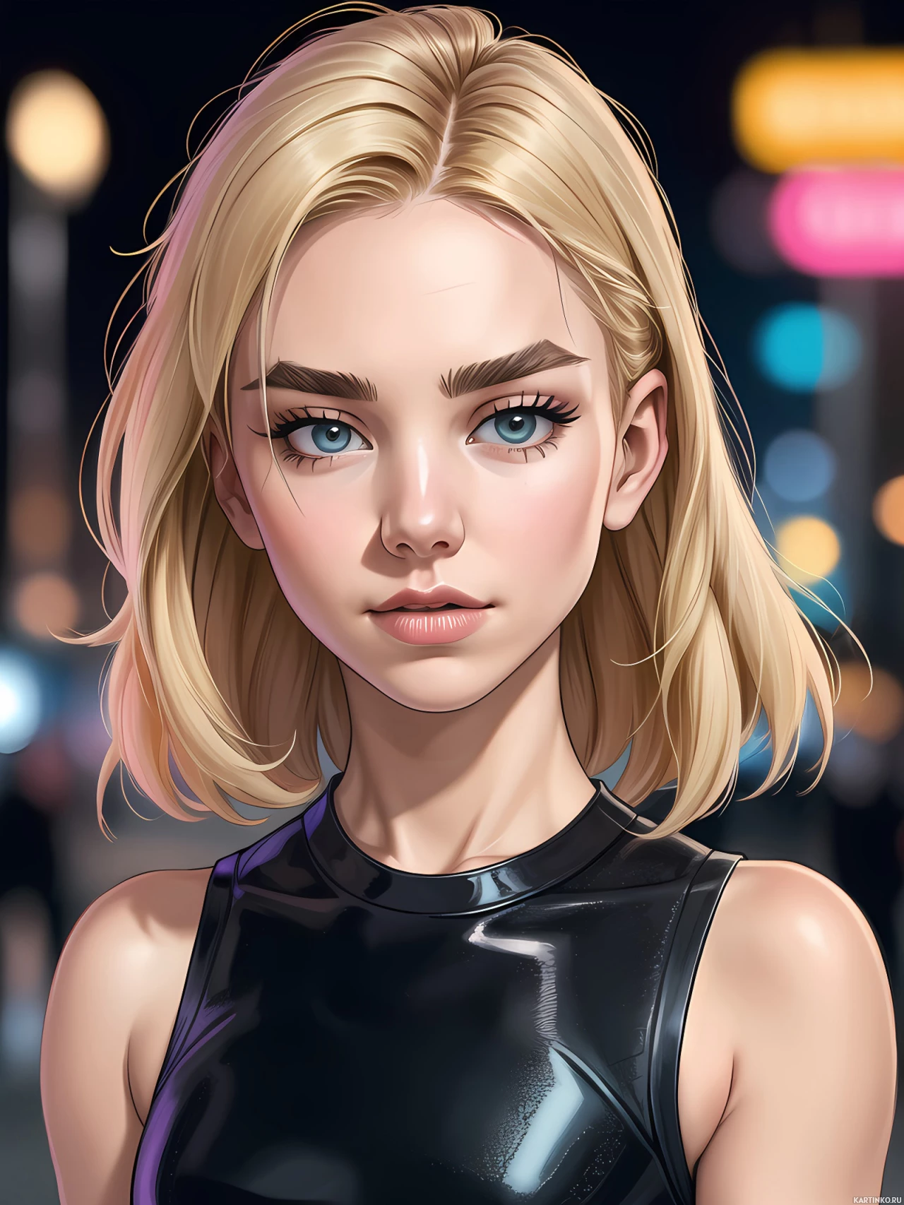 На картинке запечатлена молодая женщина с светлыми волосами и голубыми глазами, смотрящая прямо в камеру. Ее макияж включает четко очерченные брови, темную помаду и подчеркнутые скулы, что придает ей стилизованный, драматичный вид. У нее короткая, уложенная прическа, обрамляющая лицо. Девушка одета в, по всей видимости, черную кожаную куртку с застежкой-молнией, что добавляет картинке дерзкий эстетизм. Ее выражение лица нейтральное и собранное. Фон размыт, но кажется, изображает ночной городской пейзаж, возможно, улицу или переулок, создавая нуарную, атмосферу.
