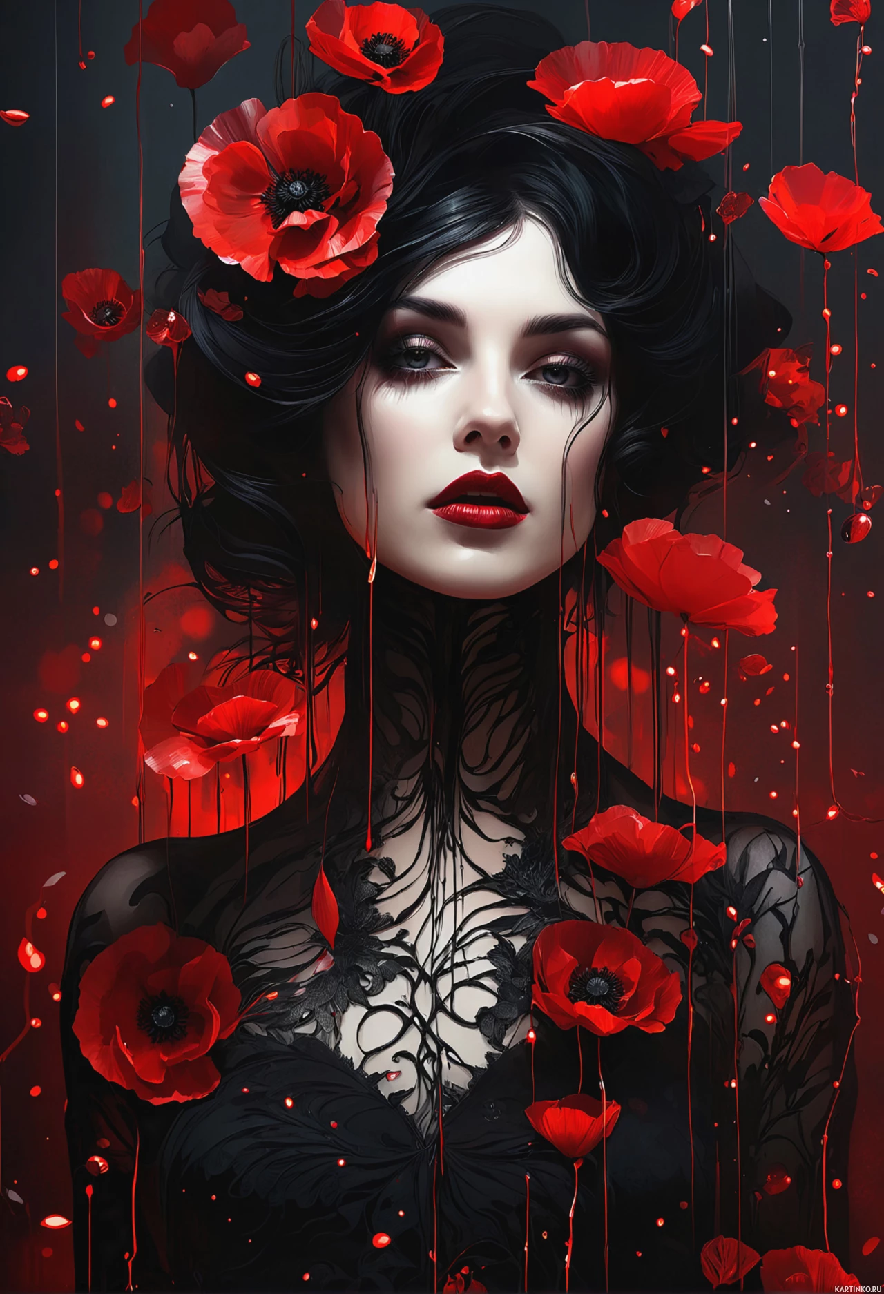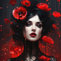 The image features a female figure with black hair. She has striking red lips and eyes that give her an intense expression. Her headgear is ornate, featuring dark feathers or similar elements that give her a dramatic appearance. She wears a garment with intricate lace designs on the shoulders, and there are red flowers integrated into the design of the attire. The background includes various floral motifs in shades of red and black, complementing the overall dark and gothic aesthetic of the image.