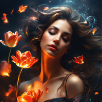 In the image, a woman with closed eyes is depicted in a stylized artwork. Her hair is flowing, and she appears to be surrounded by orbs of light that are emanating from her head. She holds a large flower with red petals and black centers close to her face. The background has dark tones, with hints of what might be fireflies or other small lights scattered around. The woman is dressed in an outfit that seems to have a fantasy or gothic design, featuring a sheer top and a long sleeve on one arm.