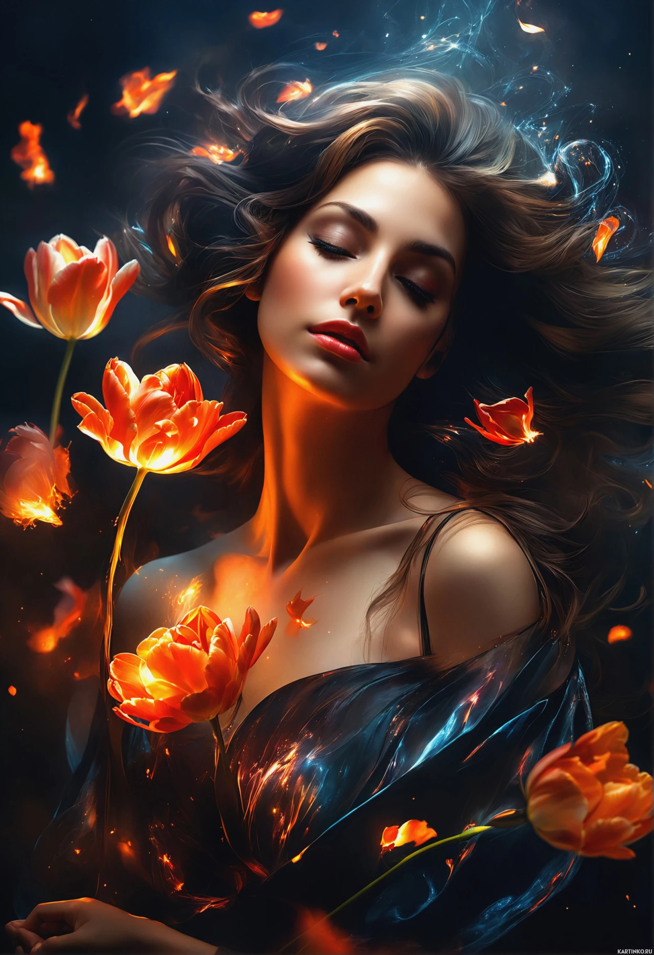 На картинке изображена женщина с закрытыми глазами в стилизованной работе. Её волосы развеваются, и кажется, будто она окружена шарами света, исходящими от головы. Она держит большое цветок с красными лепестками и чёрными серединками близко к лицу. Фон выполнен в тёмных тонах, с намёками на то, что там могут быть светлячки или другие маленькие огоньки. На ней одето платье в стиле фэнтези или готики, с прозрачной кофтой и длинным рукавом на одной руке.