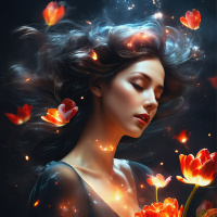 На картинке изображена женщина с каштановыми волосами, застывшая в задумчивой позе: глаза закрыты, губы слегка приоткрыты, словно она глубоко задумалась или наслаждается ароматом цветов вокруг лица. Длинные, ниспадающие волосы обрамляют её плечи. В руках у неё букет ярких, алых цветов с крупными лепестками, напоминающими георгины. Часть цветов скрыта из-за ракурса и композиции, но они добавляют картине всплеск цвета. На заднем плане видны дополнительные цветочные элементы, парящие вокруг головы. Это можно интерпретировать как распускающиеся или рассеивающиеся в воздухе цветы. Общая эстетика – это сказочность и красота, а мягкое освещение и нереальное присутствие цветов в полёте создают ощущение лёгкости и воздушности.