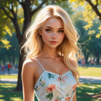 In the image, a young woman with blonde hair is seen walking in a park. She's dressed in a sleeveless dress that features a floral pattern on it. The park setting includes trees and grass, indicating an outdoor environment.