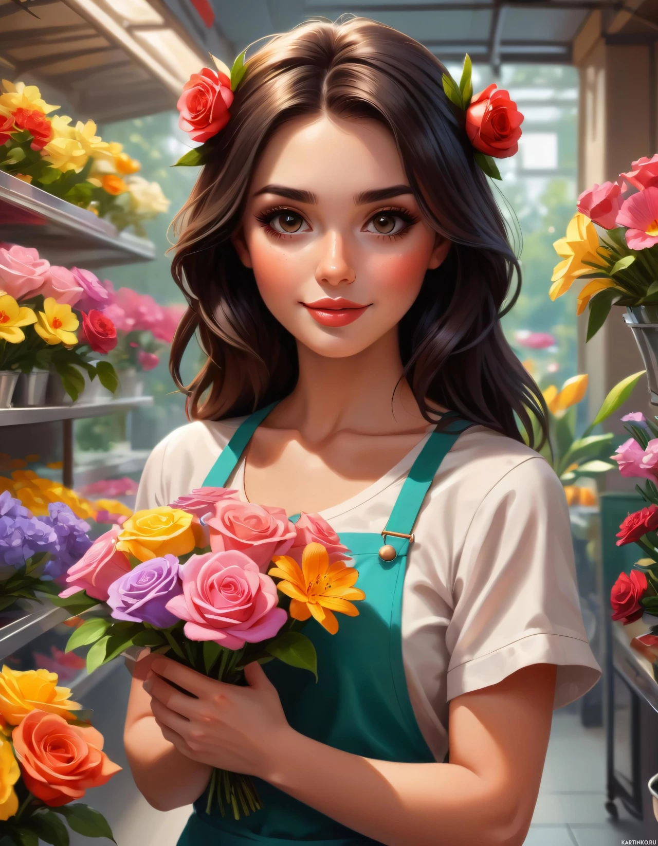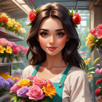 На картинке изображена молодая девушка, вероятно, лет восемнадцати-двадцати. У неё каштановые волосы до плеч и светлая кожа. Она одета в белый фартук поверх светлого топа и тёмно-зелёную повязку с розовыми цветами. В руках у неё букет разноцветных цветов — красных, фиолетовых, жёлтых и оранжевых, что, вероятно, демонстрирует ассортимент для покупателей. Она стоит в проходе цветочного магазина, окружённая множеством ярких цветов, некоторые из которых только начинают распускаться. Освещение на картинке мягкое и рассеянное, создаёт нежную тень и подчёркивает свежесть цветов.