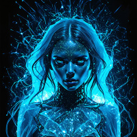 The image features a character that appears to be female with a futuristic, high-tech design. She has long blonde hair and her complexion is pale. Her attire consists of intricate lines and patterns on her skin and body, predominantly in shades of blue and white. There are electrical arcs or sparks emanating from behind her head, suggesting a connection to technology or energy. The overall style of the image is sleek and modern, with a dark background that highlights the character.