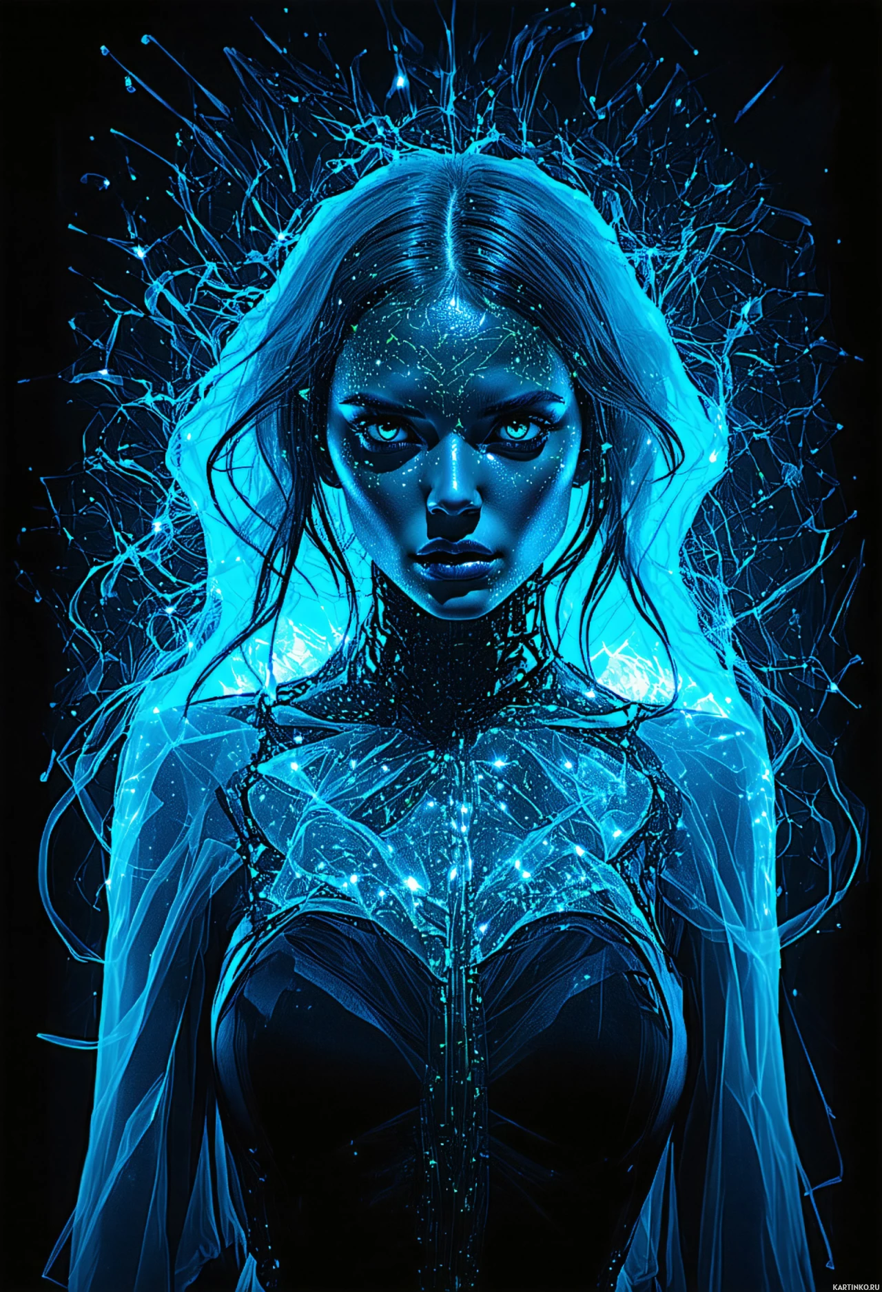 На картинке изображена девушка с футуристичным, высокотехнологичным дизайном. У неё длинные светлые волосы и бледная кожа. Её одежда представляет собой сложный узор из линий и рисунков, преобладающих в сине-белых тонах. За головой видны электрические разряды, будто бы она подключена к энергии или технологиям. Общий стиль картинки — гладкий и современный, на фоне тёмного пространства, что выгодно подчёркивает персонажа.