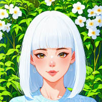 The image depicts a stylized illustration of a female character with white hair, wearing a blue outfit. She has light eyes and is adorned with what appears to be earrings. Her expression is neutral, and she gazes directly at the viewer. Behind her is a backdrop of lush greenery with small yellow flowers blooming around her. The artwork has a vibrant, colorful aesthetic with a smooth finish that suggests it might be digitally created or painted on a high-quality surface.