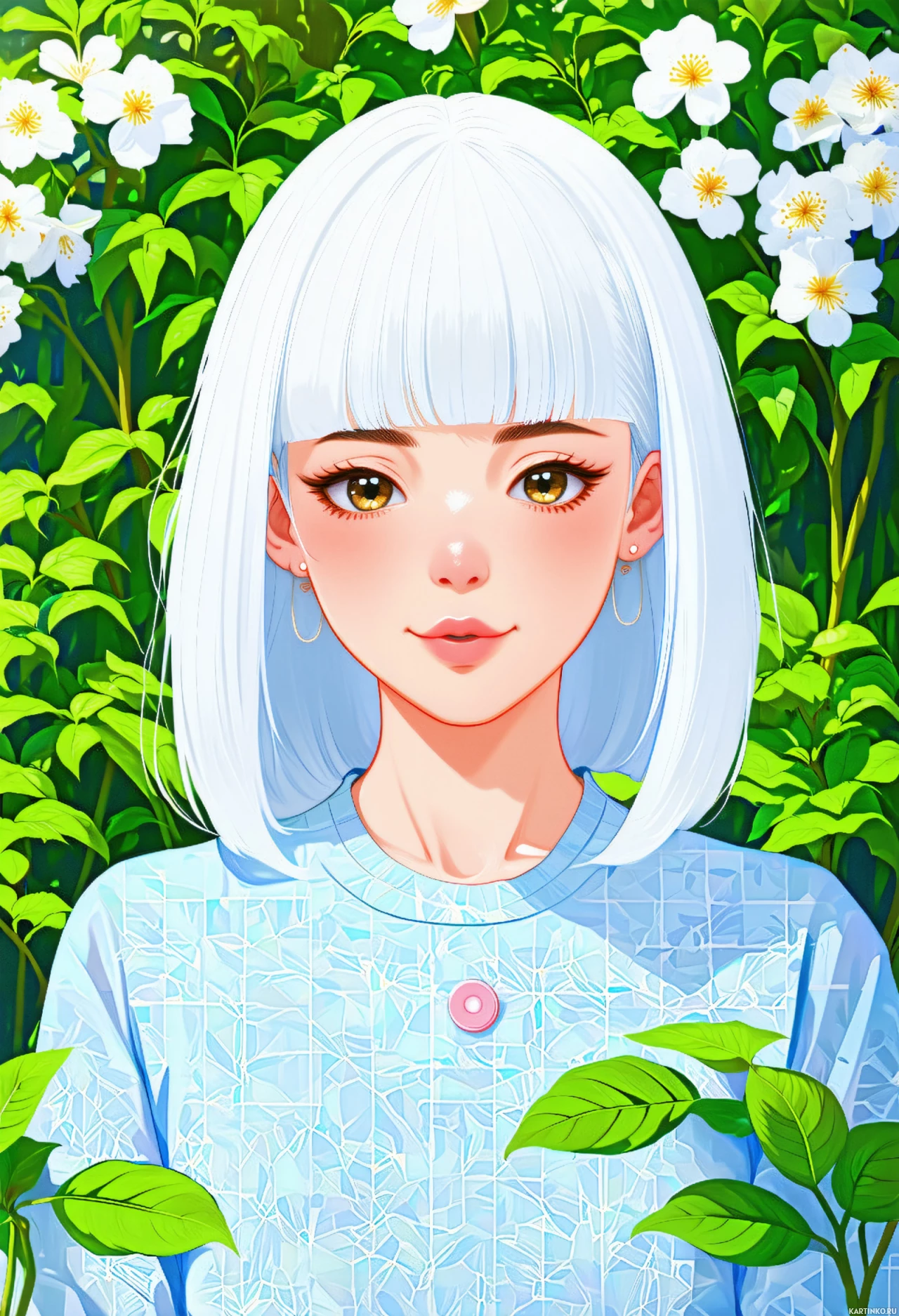 Картинка изображает стилизованный рисунок девушки с белыми волосами в голубой одежде. У нее светлые глаза и, кажется, серьги. Выражение лица нейтральное, и она смотрит прямо на зрителя. На заднем плане – пышная зелень с мелкими желтыми цветами. Работа выполнена в яркой, красочной стилистике и имеет гладкую поверхность, что говорит о цифровом создании или росписи на качественном материале.