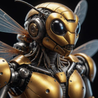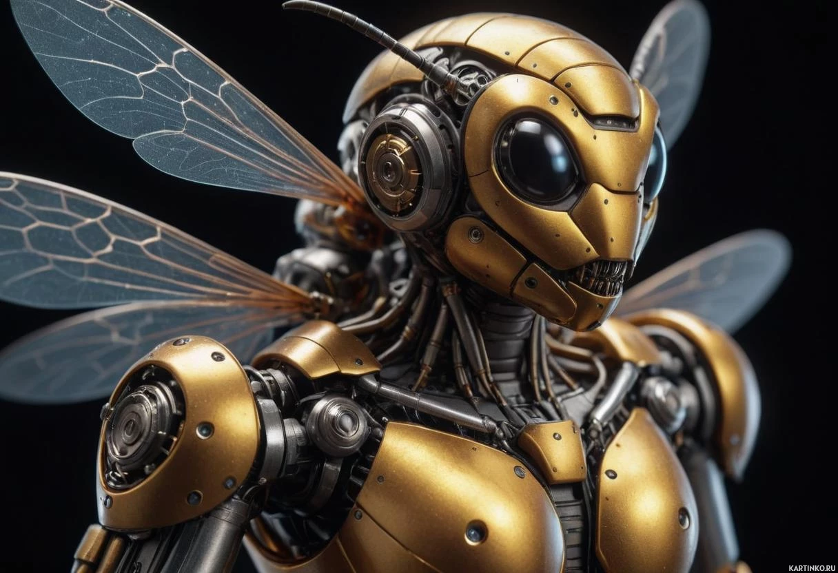 The image features a robot designed to resemble an insect, specifically a bee. The robot's body is yellow with