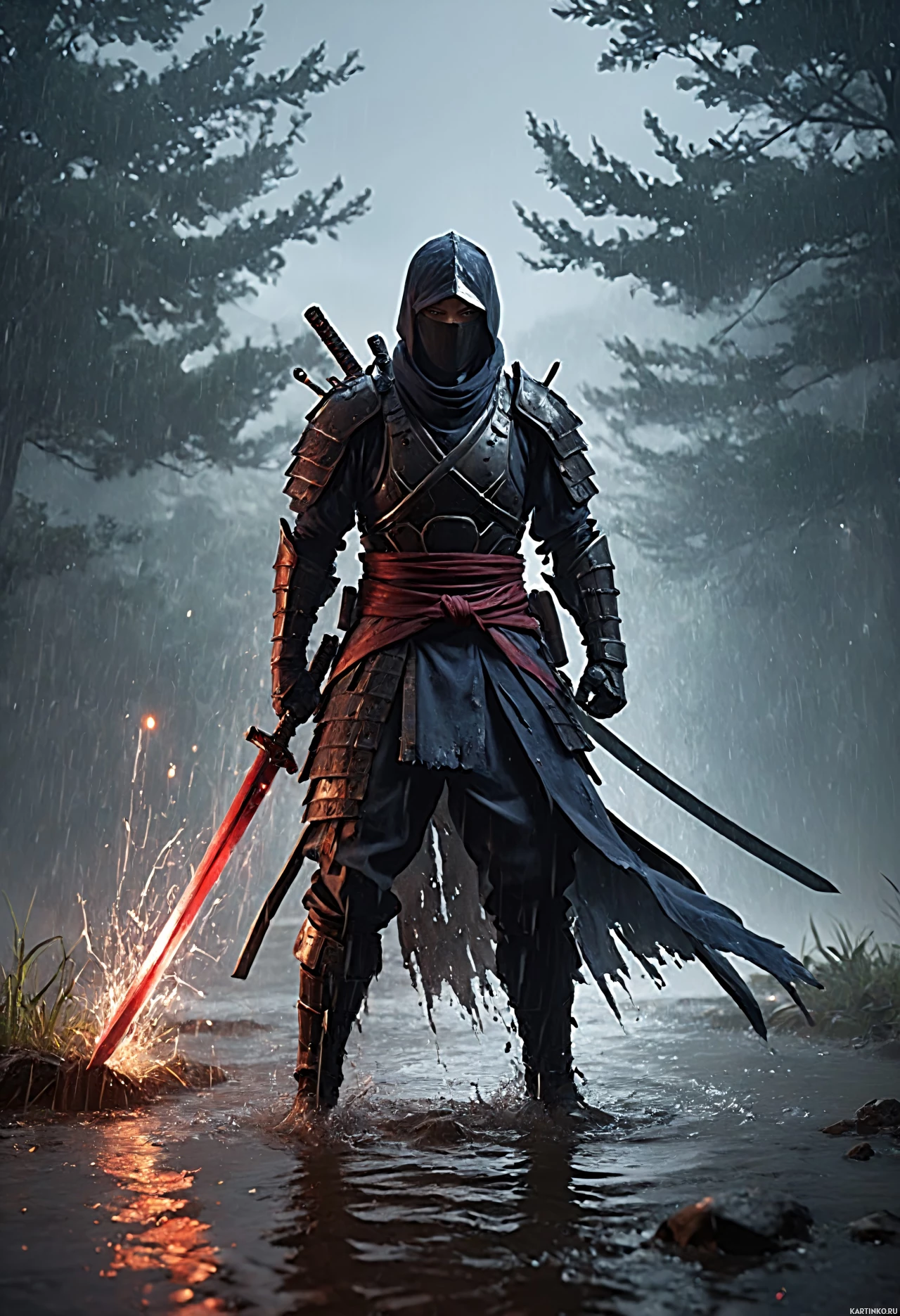 Это картинка с мужским персонажем, одетым в доспехи воина из видеоигры "Assassin's Creed". У персонажа черные волосы, на нем капюшон и доспехи, в правой руке он держит меч. Он стоит на фоне дождливой ночи, окруженный лесом, и кажется, будто он в движении – то ли бежит, то ли идет по воде.
