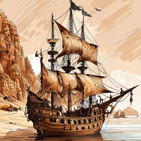 На картинке изображён традиционный парусный корабль на спокойном море, с песчаным пляжем слева и скалистыми обрывами справа. Рядом с носом судна стоят несколько фигур, занятых в чём-то, что может указывать на то, что это члены команды или, может быть, пираты. Небо чистое и голубое, что говорит о хорошей погоде. У корабля несколько мачт с квадратными парусами, частично скрученными, что говорит о его неподвижности. В целом, стиль картинки тяготеет к фэнтезийной иллюстрации, запечатлевая сцену из воображаемой или исторической эпохи.