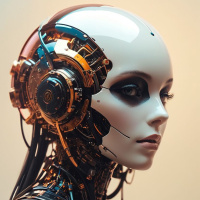 The image depicts a humanoid robot with a female human-like face. The robot has silver metallic skin and features such as eyes, eyebrows, nose, lips, and mechanical components that resemble an arm or part of a chest piece. The background is neutral, highlighting the robot's details. This image is commonly associated with science fiction themes involving artificial intelligence and robots.