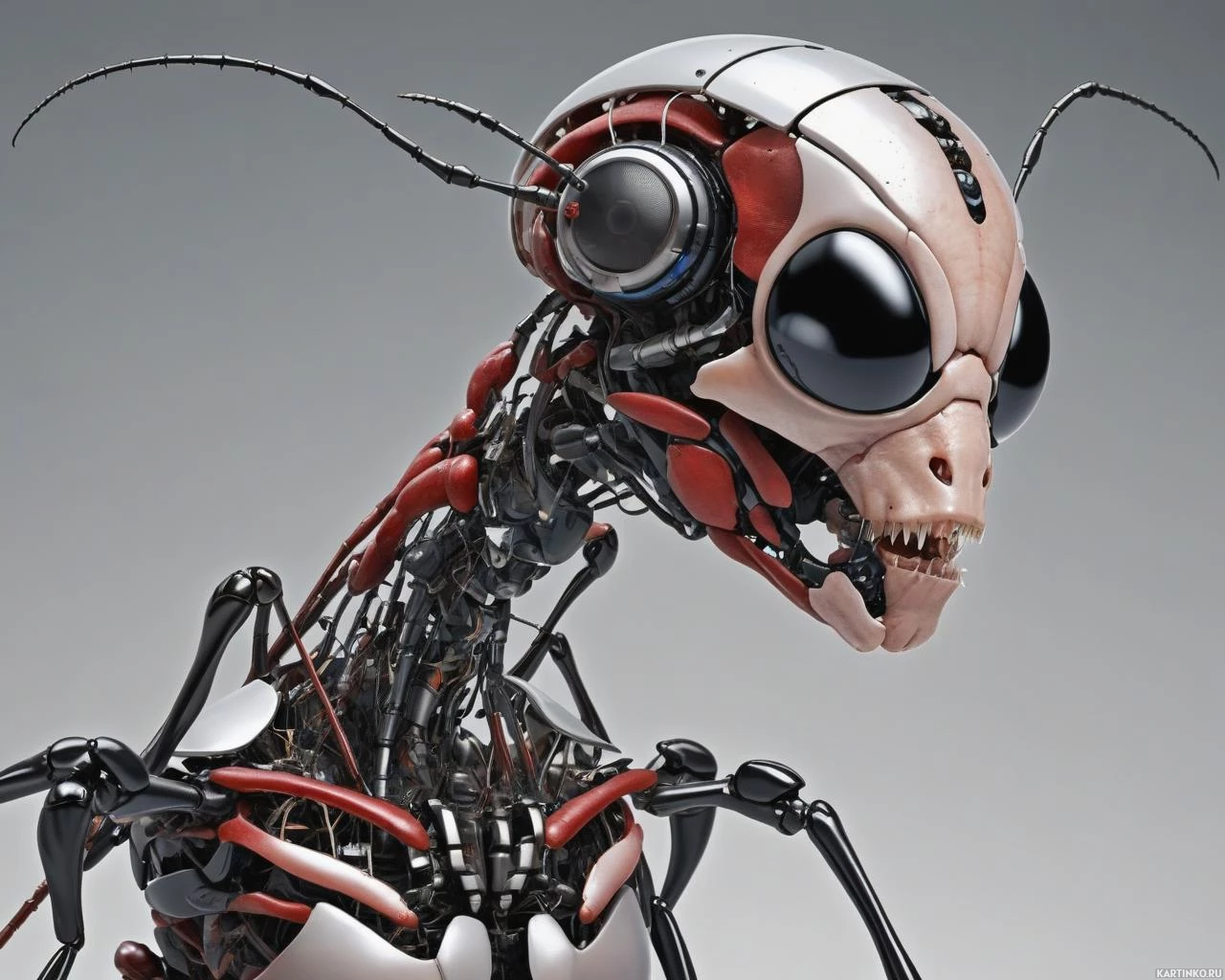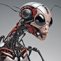a humanoid robot with insect-like features, such as an exoskeleton and multiple legs. It has a pair of antennae atop its head and what appears to be
