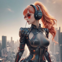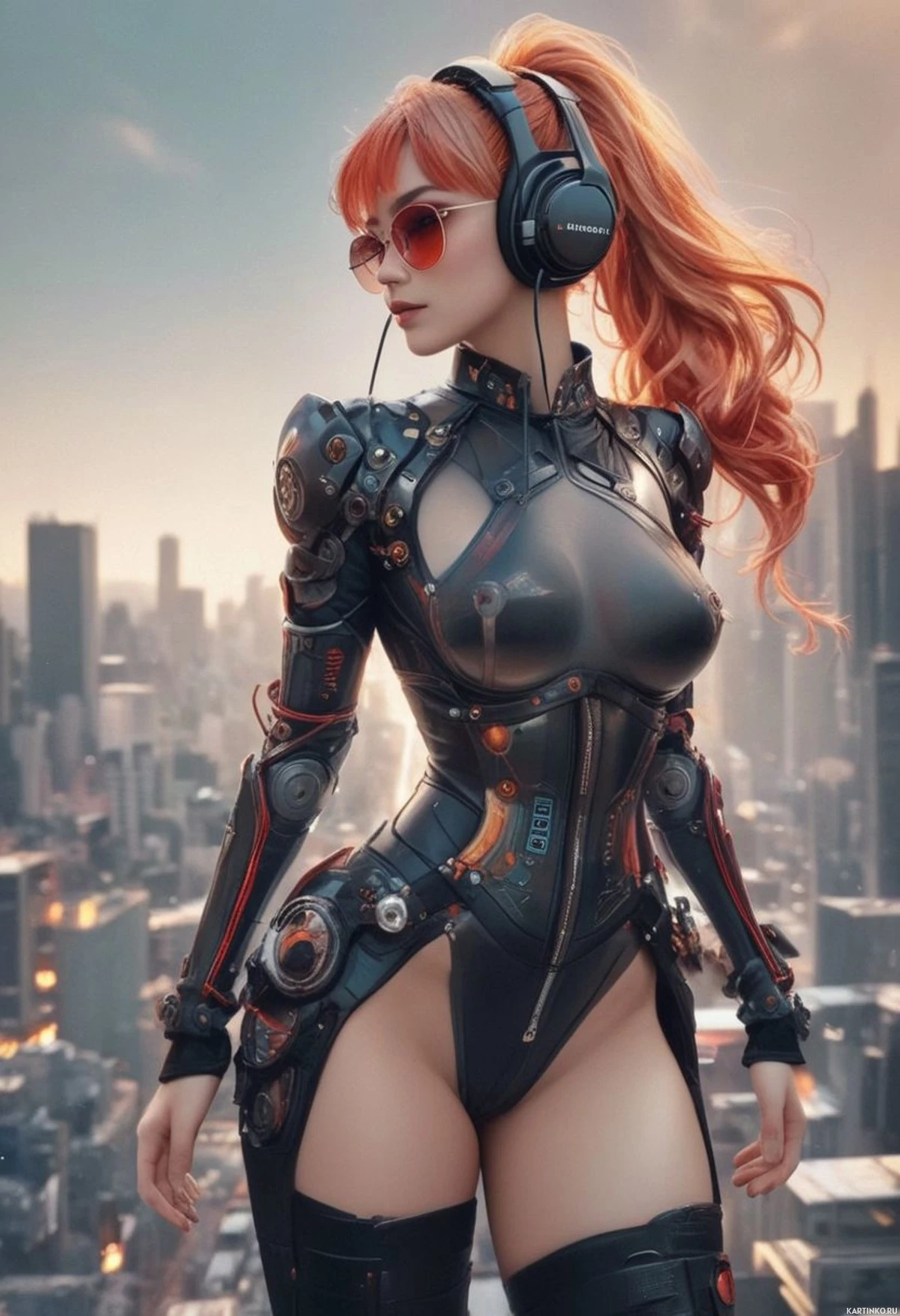 На картинке изображена девушка с красными волосами в солнцезащитных очках и наушниках, на фоне футуристического городского пейзажа. На ней чёрный бронированный костюм с высокотехнологичным дизайном. Окружающий мир указывает на научно-фантастическую тематику.