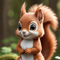 The image features a stylized, anthropomorphic squirrel character sitting on a rock in what appears to be a forest setting with soft lighting and misty atmosphere. The squirrel has human-like eyes, eyebrows, and is smiling slightly while clasping its paws together, as if it's resting or posing for the photo. Its fur looks soft and well-groomed, and it has a small tail with visible fluff at the end. The background includes mossy rocks, greenery, and what appears to be a water source like a creek in the distance, contributing to a serene and naturalistic environment.