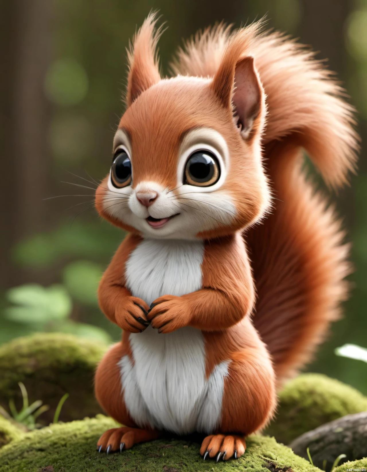 На картинке изображен стилизованный, антропоморфный бельчонок, сидящий на камне в лесу. Мягкий свет и туман создают спокойную атмосферу. У бельчонка человеческие глаза и брови, он слегка улыбается и сжимает лапки, словно отдыхает или позирует для фотографии. Его шерстка выглядит мягкой и ухоженной, а на кончике хвоста видны пушистые пёрышки. На заднем плане — поросшие мхом камни, зелень и, похоже, ручей вдалеке, что создает идиллическую и естественную обстановку.