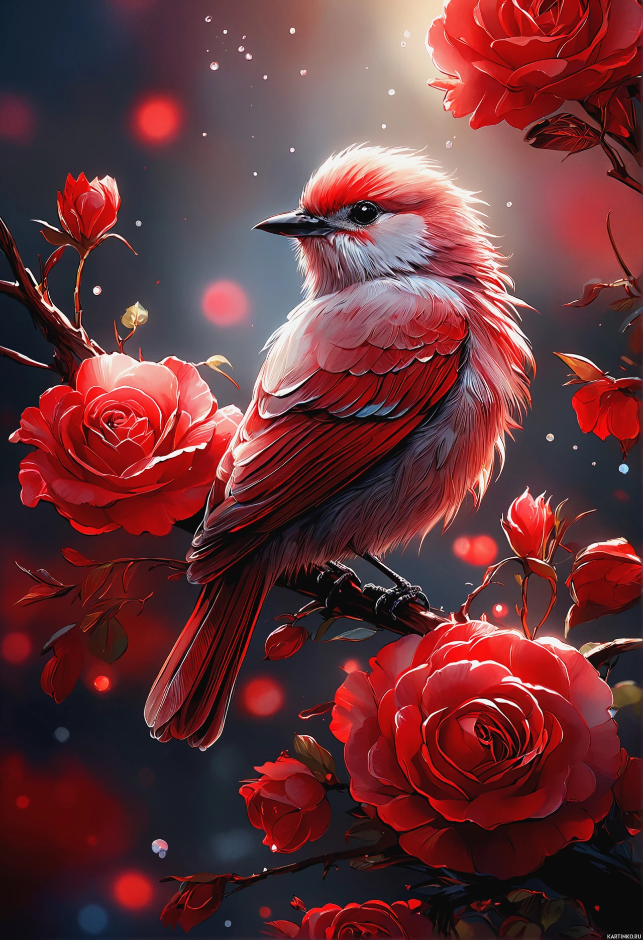 На картинке – белая птица с красными отметинами на крыльях и груди сидит на ветке, украшенной красными розами. На заднем плане – темное небо, постепенно светлеющее к верху, что создает ощущение рассвета или заката.