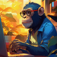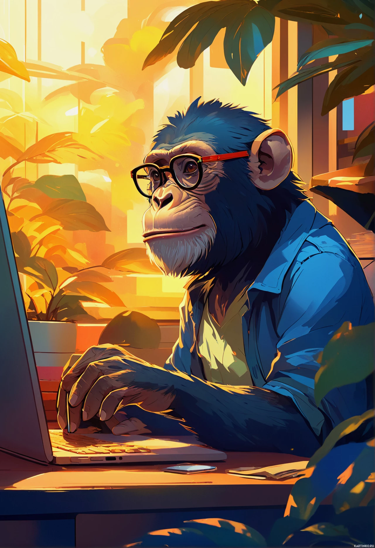 На картинке запечатлен шимпанзе в интерьере, напоминающем офис, на фоне заката. На шимпанзе очки и джинсовая рубашка, что придает ему человеческие черты. Он сидит за столом с руками на клавиатуре, словно работает на ноутбуке. На столе стоит чашка кофе. Справа в переднем плане виден цветок в горшке, а на заднем плане – фотографии в рамках и окно, через которое видно теплое небо, возможно, это вечер.