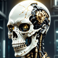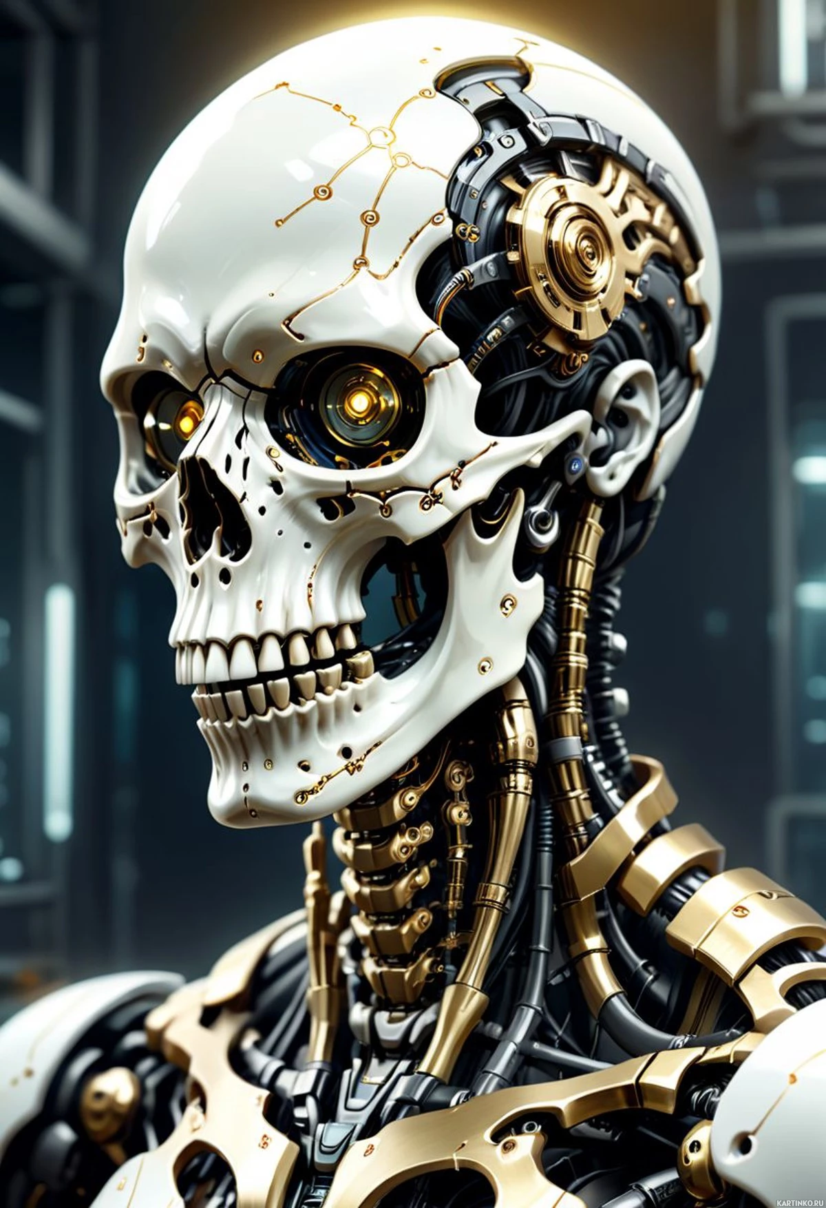 a science fiction-themed robot with an intricate design. It features what appears to be a human skull with artificial enhancements, including mechanical structures and