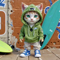 На картинке изображён антропоморфный кот, стоящий на двух лапах. На нём толстовка с капюшоном, который опущен, и рукава закатаны, обнажая передние лапы в голубых кроссовках. Глаза кота широко открыты и смотрят вперёд. За котом прислонён синий серф, опирающийся на стену с потёртой деревянной текстурой. Общий стиль картинки – мультяшный и сказочный.