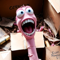 The image features a bright pink toy worm with big eyes and an open mouth, as if it's laughing or screaming. It is positioned inside a brown cardboard box that appears slightly crushed at the edges. The bottom of the box contains various discarded items, including what looks like coins and possibly some broken glass or small shards of metal or plastic.