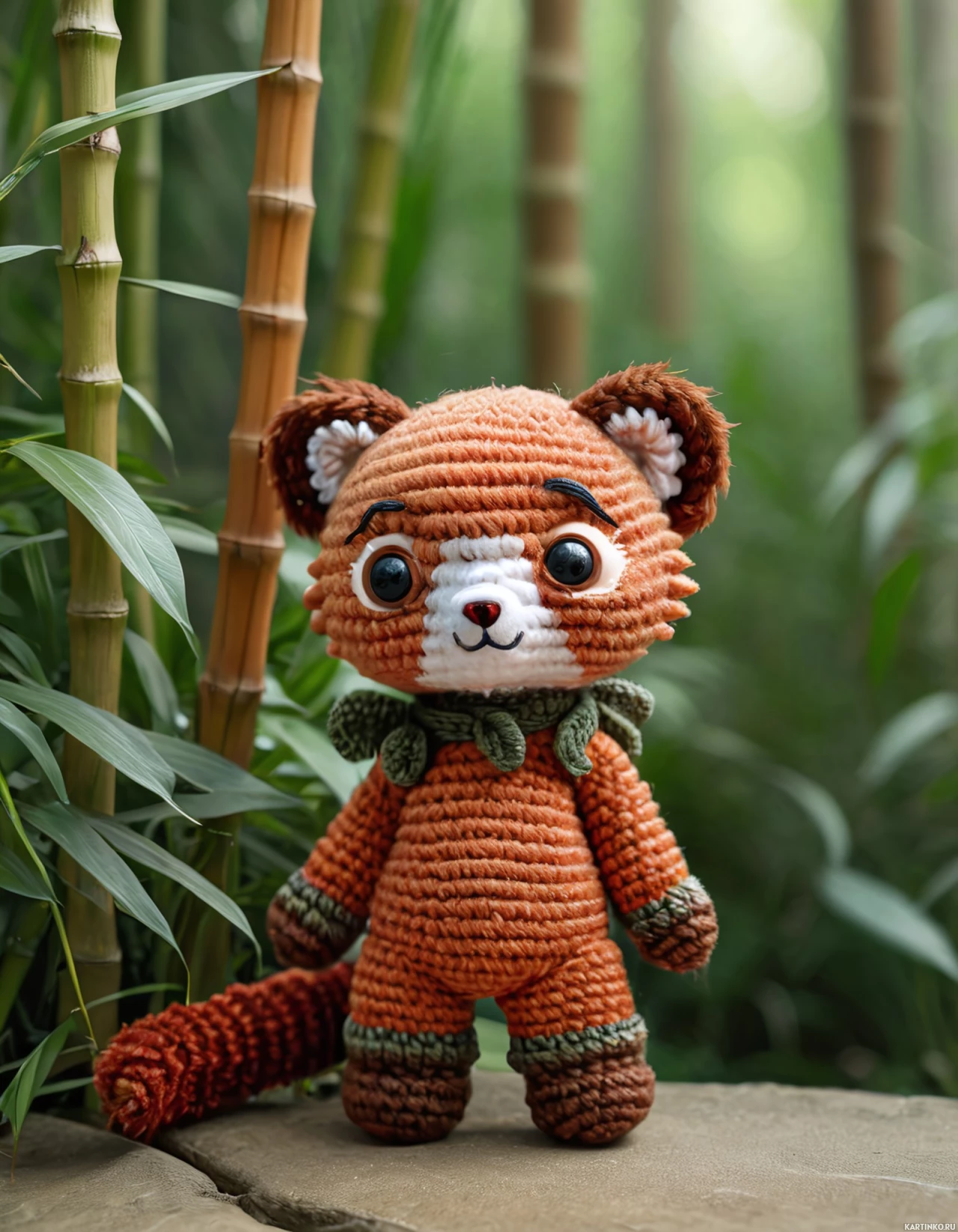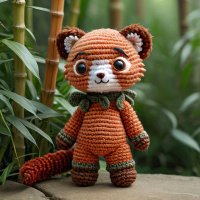 red panda, which is the central figure in this picture, appears to have black eyes and a white muzzle and paws. It's sitting on what looks like