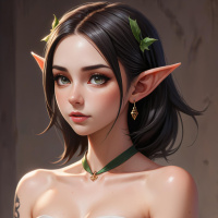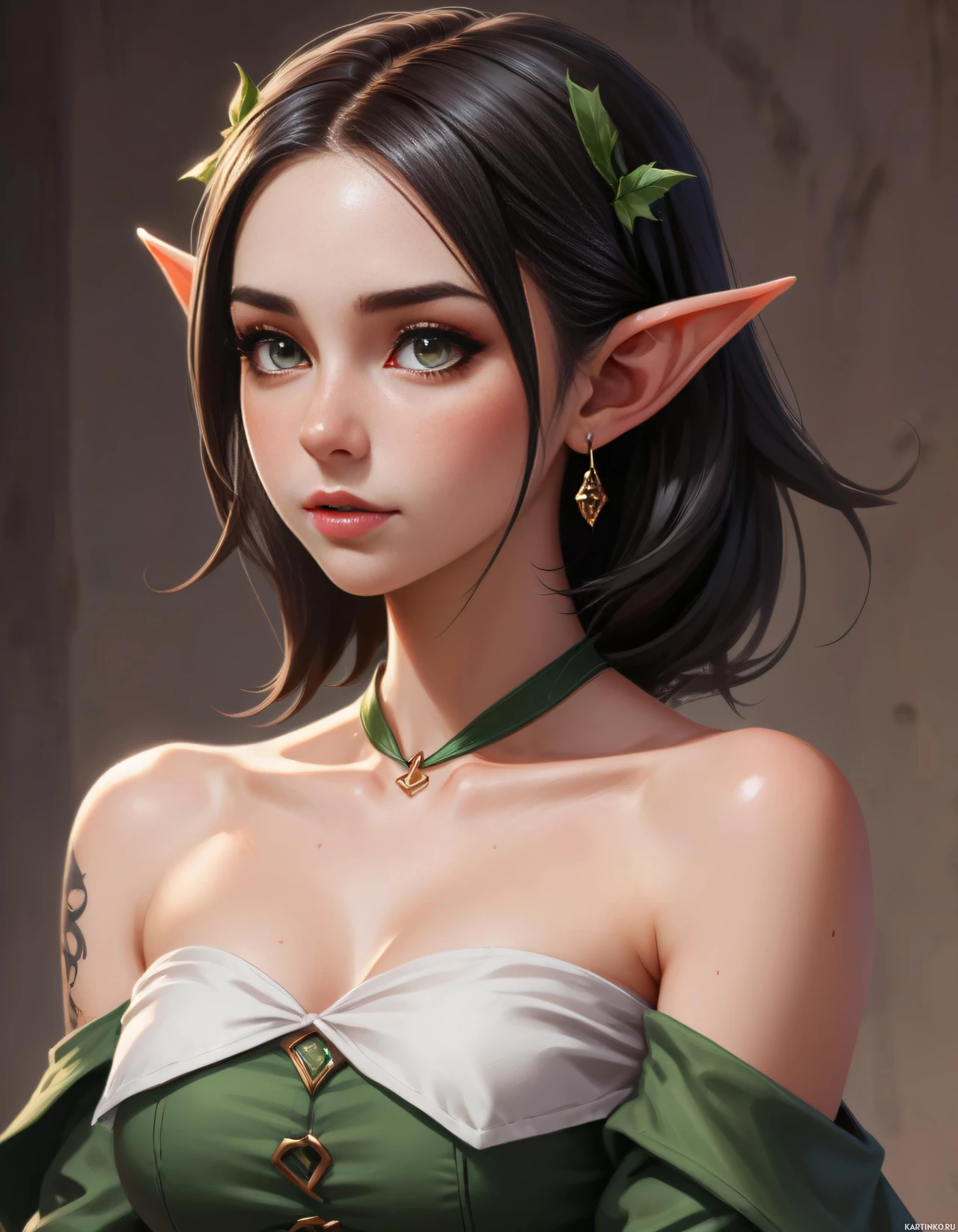 На картинке изображена персонаж с заостренными ушами, что указывает на ее эльфийский облик. У неё тонкие брови, и она смотрит прямо на зрителя. Кожа светлая, на лице легкий румянец, подчеркивающий скулы. Темные волосы уложены в высокую прическу, на лбу и шее видны вены, что придает портрету реалистичности. На голове у нее ободок с растительным орнаментом. Одежда состоит из одежды с пышными рукавами, напоминающей либо доспехи, либо исторический костюм, в оттенках темно- и светло-коричневого, поверх которой надет многослойный полупрозрачный верх, который можно интерпретировать как корсет или лиф. Общий стиль картинки — реализм с элементами фэнтези, вероятно, созданный для того, чтобы передать атмосферу персонажа из сказочного мира.
