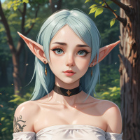 This image features an illustration of a female character with elven features. She has pale skin, pointed ears, and her hair is styled in blueish tones, suggesting a fantasy setting. The character is wearing what appears to be historical or fantasy-inspired clothing, including a blouse with ruffles on the sleeves, and she has a visible tattoo on her right shoulder area. Her makeup is done in a way that enhances her ethereal look, and she has an expressive gaze directed towards the viewer. The background of the image shows a forest scene with trees that have green leaves, indicating it could be spring or summer. The character's positioning within this environment suggests she might be in a secluded part of the forest. The overall impression is one of fantasy and otherworldliness.
