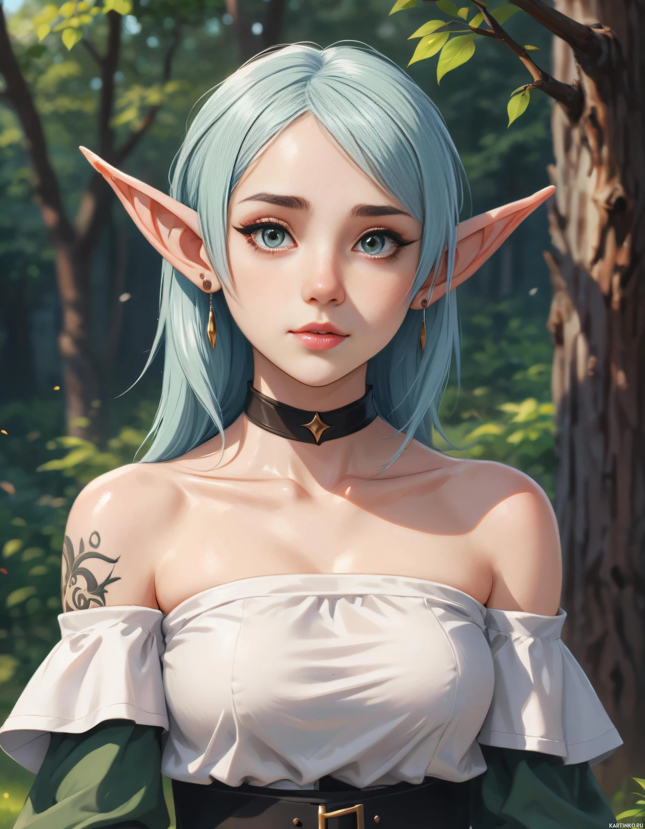 На картинке изображена иллюстрация девушки с эльфийскими чертами. У неё бледная кожа, заострённые уши, а волосы окрашены в голубоватые тона, что намекает на фантастический сеттинг. На ней одежда, выполненная в историческом или фэнтезийном стиле, включая блузку с воланами на рукавах, и на правой половине плеча виден татуировка. Макияж подчёркивает её неземную красоту, а взгляд выразительный и направлен на зрителя. Фоном служит лесной пейзаж с деревьями в зелени, что говорит о том, что это может быть весна или лето. Положение девушки в этом окружении предполагает, что она находится в укромном уголке леса. Общее впечатление – ощущение сказочности и потусторонности.