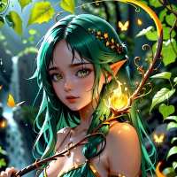 The image features a character with green hair, styled in an elf-like appearance. She has pointed ears and fair skin. The character is wearing a green garment that appears to be a magical outfit, complete with what looks like a sparkly or mystical emblem on her chest. In one hand, she holds a staff, adorned at the top with a magical-looking crystal. The setting suggests a fantasy environment with a backdrop of lush greenery and a waterfall in the background, suggesting a serene and enchanted land. There are also small butterflies flitting around her head, adding to the whimsical atmosphere of the image.