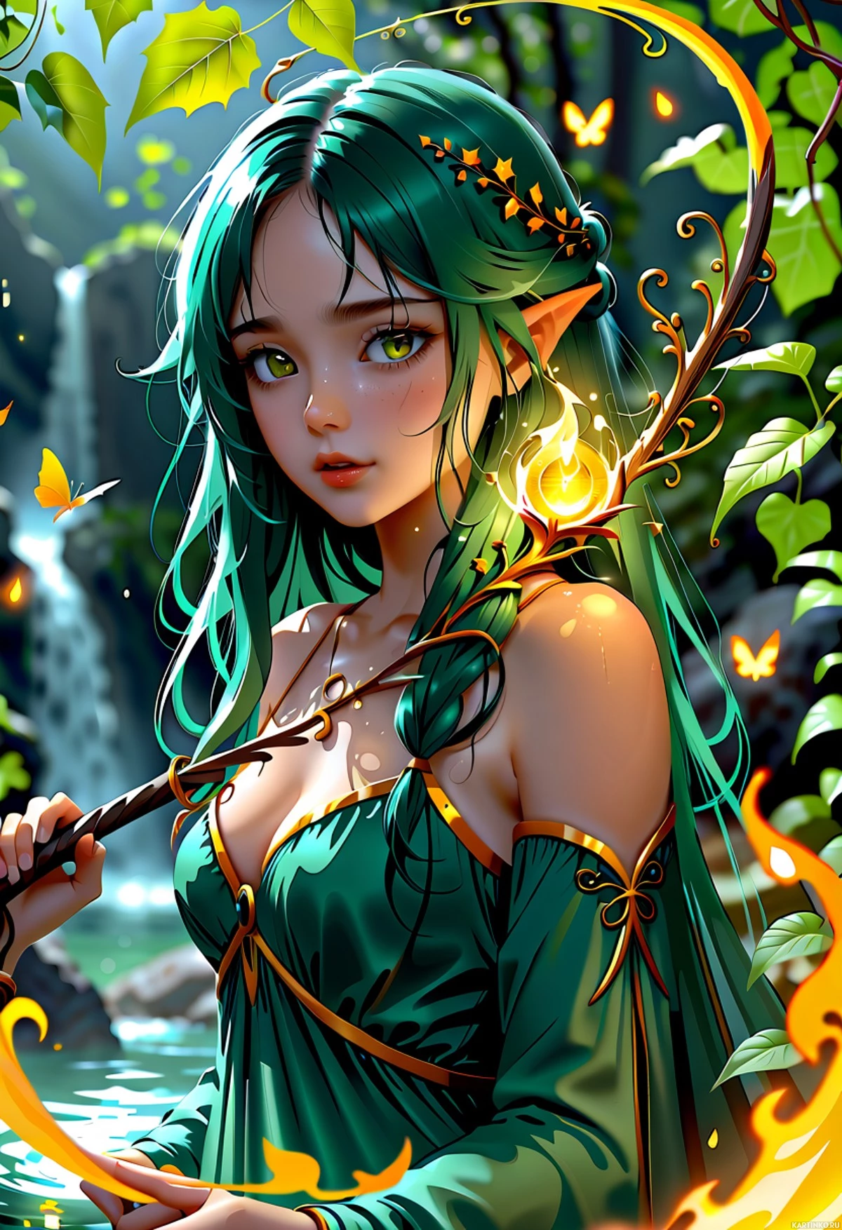 На картинке изображена героиня с зелеными волосами, уложенными в эльфийском стиле. У нее заостренные уши и светлая кожа. Она одета в зеленое платье, похожее на магический наряд, с сверкающим или мистическим знаком на груди. В одной руке она держит посох, украшенный наверху кристаллом, излучающим магию. Задний план создает впечатление сказочного мира с буйной зеленью и водопадом, что придает пейзажу умиротворенность и волшебство. Вокруг ее головы порхают маленькие бабочки, добавляя картинке очарования.