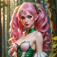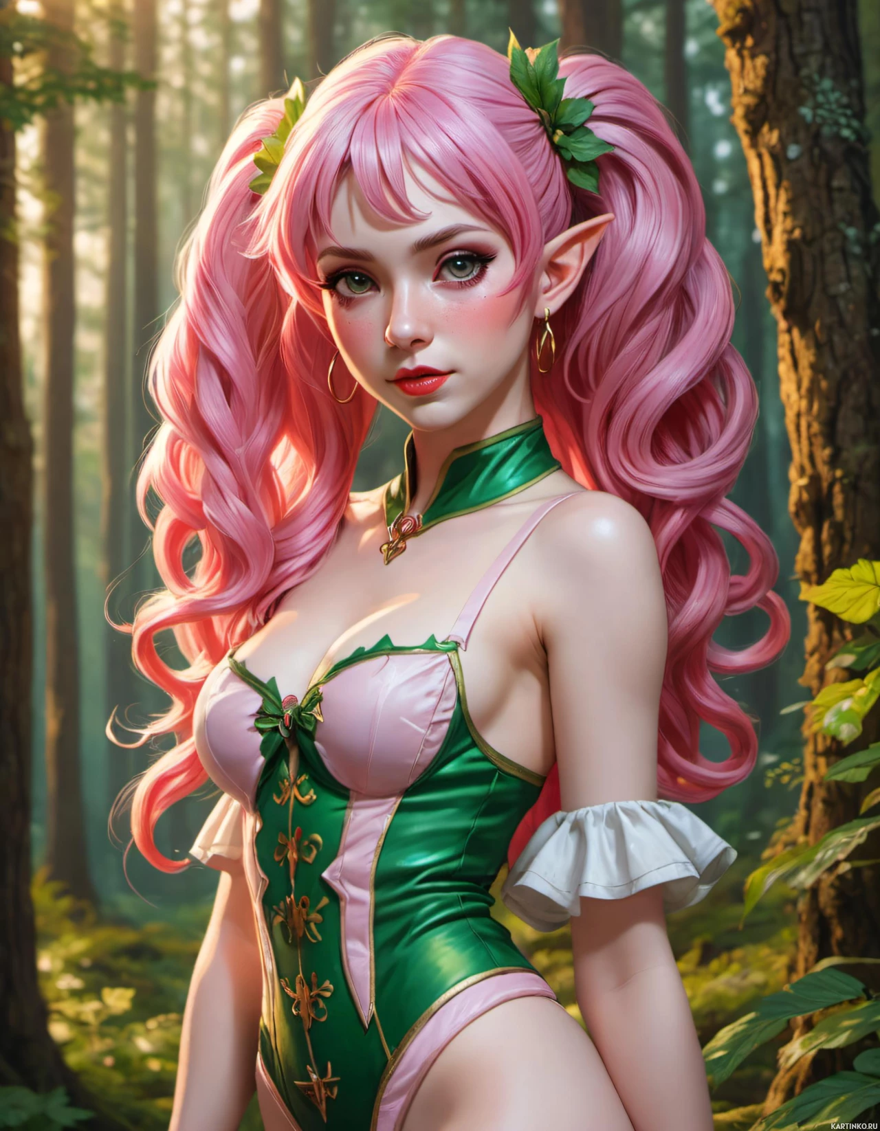 In the image, a character with pink hair styled in pigtails and large, expressive eyes is depicted. The character is wearing a green elf costume with gold detailing and a ruffled collar. She stands amidst a forest setting, surrounded by moss-covered trees and the undergrowth of foliage typical of a woodland environment.