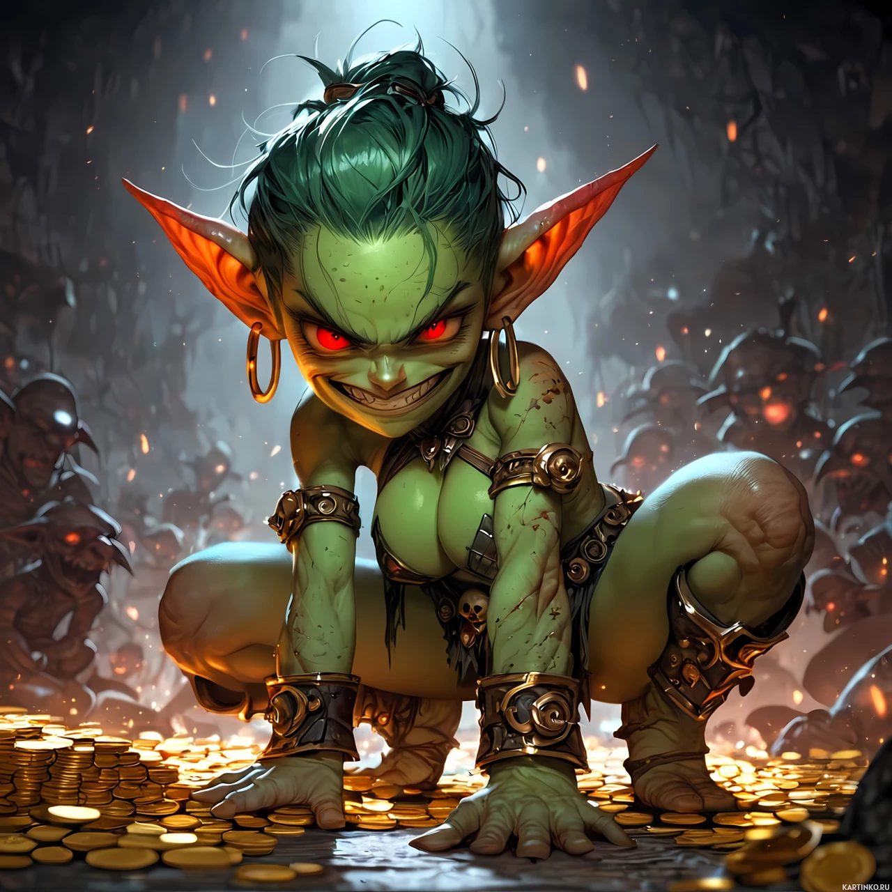 На картинке изобранена фантастическая сцена с главным персонажем, похожим на зеленокожего гоблина. У этого существа заостренные уши, острые зубы и свирепое выражение лица. Он сгорбился над грудой золотых монет, будто собирается напасть или защищать сокровище от других существ на заднем плане. Эти существа не полностью видны, но по позе и наличию, по всей видимости, шерсти, похоже, это волки. Место действия напоминает подземное помещение со стенами из камня, как в подземелье.