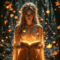 blonde hair, dressed in an elegant fantasy costume. She is holding a small book or tome and appears to be reading it while standing in the midst of a forest adorned with falling