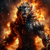 The image depicts a fantasy figure that appears to be an anthropomorphic animal, with a muscular build and fiery elements in the background. The character has red and blue skin or fur, with intense eyes. It is wearing dark armor or tunic, and there are flames around it, suggesting a connection to fire.
