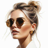 На картинке запечатлена молодая женщина с светлыми волосами в профиль. На ней большие солнцезащитные очки и светлый блейзер поверх белой рубашки. Волосы у нее собраны в высокую прическу, что придает ей элегантный вид.