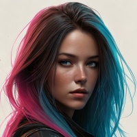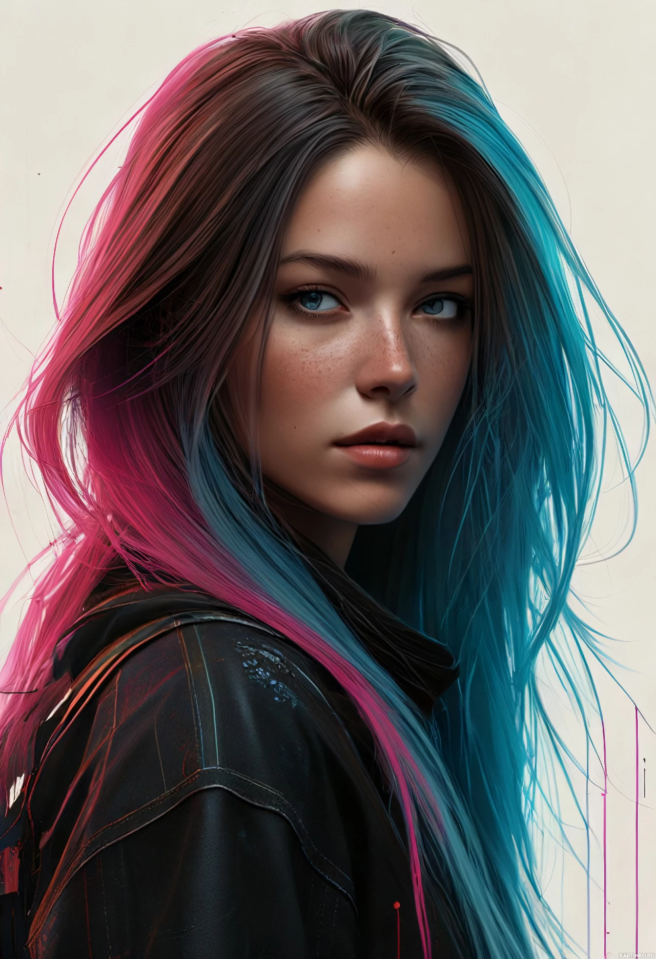 Это цифровая картинка девушки с длинными, яркими разноцветными волосами. У нее голубые глаза, а выражение лица нейтральное, с легким намеком на любопытство или задумчивость. На ней черная куртка поверх темного топа, а на левой стороне лица видны брызги радужных цветов. Взгляд направлен немного вправо, а на заднем плане – некая абстрактная живопись или дизайн, включающая оттенки синего, розового и желтого, что можно интерпретировать как стилизованные мазки кистью или абстрактные формы. Картинка выполнена в духе современного искусства благодаря использованию цвета и композиции.