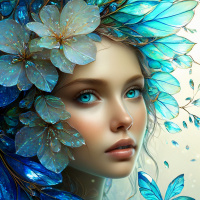 The image features a close-up portrait of a female character with detailed facial features and an ethereal aesthetic. She has light skin, fair eyebrows, full lips, and her eyes are looking slightly to the side with a gentle gaze. Her hair is dark and appears smooth, parted in the center. On her forehead, there is a crown-like headpiece adorned with symmetrical elements that resemble flowers or floral patterns in shades of blue and white. These embellishments feature petal-like structures connected by stems, giving the impression of blossoming flowers. The overall style of the image is digital artwork, characterized by its high level of detail, soft lighting, and fantasy elements. The use of bright colors, particularly blue tones, contributes to a dreamy or otherworldly atmosphere.