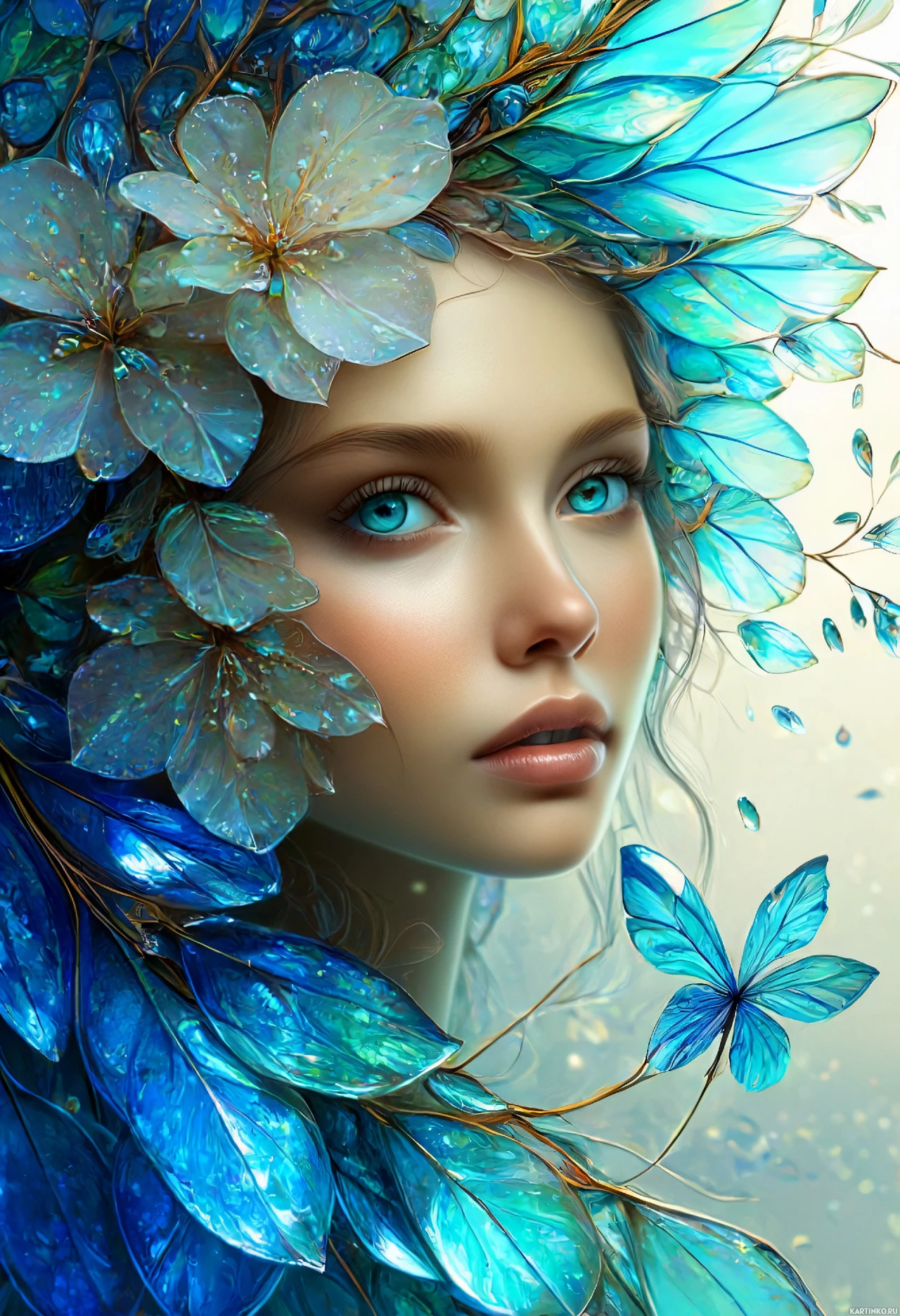 На картинке – крупный портрет девушки с проработными чертами лица и неземной эстетикой. У неё светлая кожа, светлые брови, пухлые губы, а взгляд направлен чуть в сторону с мягкостью. Волосы тёмные и гладкие, с центральным пробором. На лбу – головной убор, напоминающий корону, украшенный симметричными элементами, похожими на цветы или цветочные узоры в оттенках синего и белого. Эти украшения выполнены в виде лепестков, соединенных стебельками, создавая впечатление распускающихся цветов. В целом, картинка выполнена в стиле цифрового арта, отличается высокой детализацией, мягким освещением и элементами фэнтези. Использование ярких цветов, особенно синих оттенков, создает мечтательную или неземную атмосферу.
