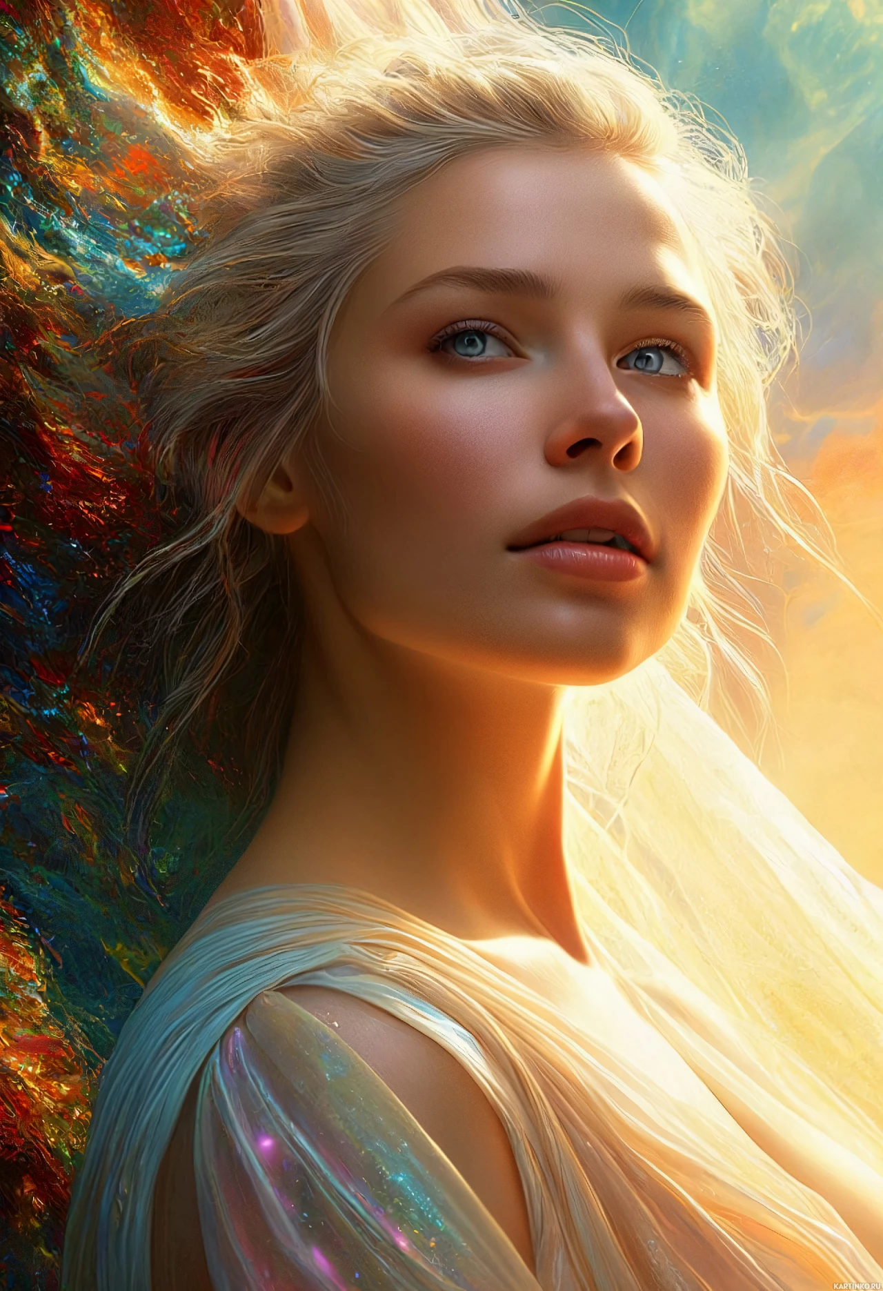 The image features a young woman with blonde hair against a backdrop that resembles a stylized sunset or sky. She has her head slightly tilted and is looking away from the viewer, towards the right side of the frame. Her expression is contemplative, and she appears to be gazing into the distance. The lighting on her face and neck is soft and warm, suggesting a halo-like effect around her head, which adds to the serene or otherworldly atmosphere of the image. She has delicate features, including full lips and well-defined eyebrows, and her eyes have a gentle gaze. Her hair cascades down her shoulders in soft waves, and she appears to be wearing makeup that enhances her facial features subtly. The color palette is dominated by warm tones of oranges, yellows, and reds, which contrast with the cooler hues in the background. The artwork has a fantastical and perhaps religious or mythological vibe, as suggested by the halo effect around her head and the soft light that seems to emanate from her face. The overall composition is balanced, with the subject centrally placed within the frame.